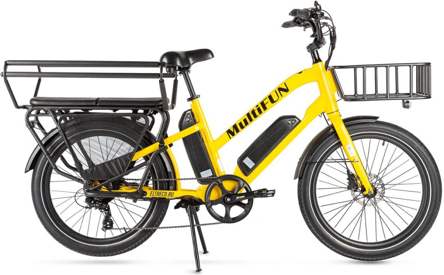 Особенности модели Eltreco MultiFun включают в себя два аккумулятора 48В/10,4 Ач, редукторный электромотор мощностью 500 ватт, большой трансформирующийся задний багажник, прочную переднюю корзину, подножки для пассажиров, толстые колеса 24" x 3.0", гидравлические дисковые тормоза, большой LCD-дисплей, переднюю фару и задний габаритный фонарь.