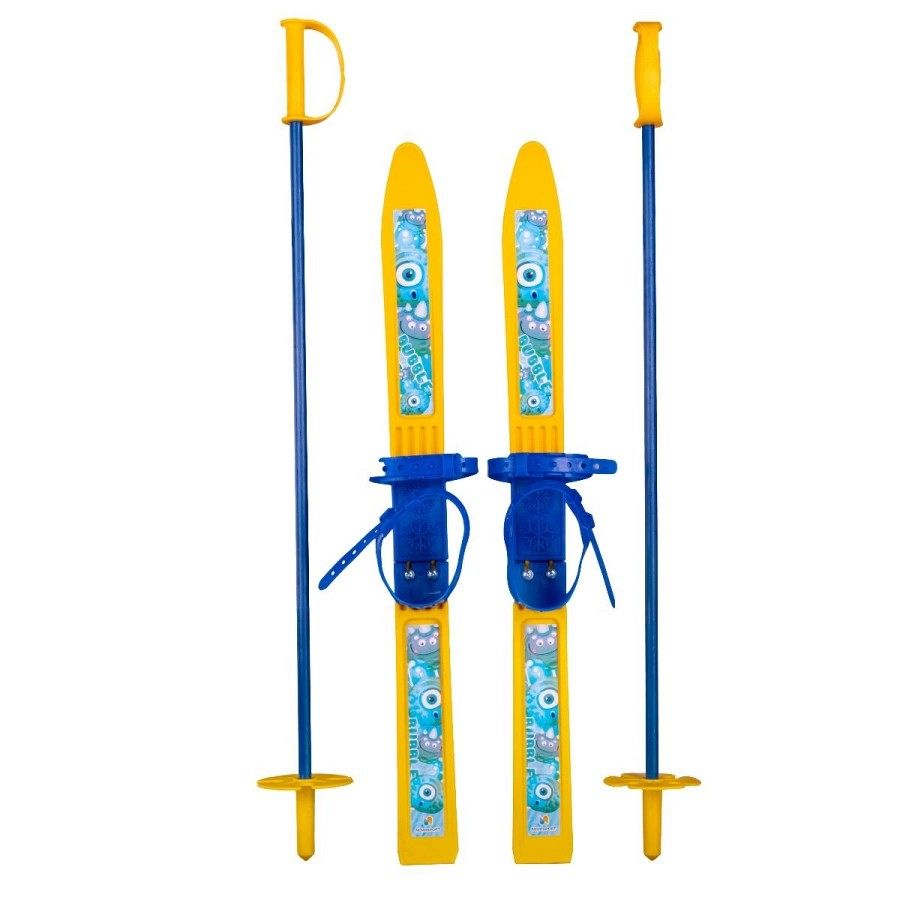 Комплект оснащён удобными пластиковыми креплениями, рассчитанными на повседневную обувь размером от 24 до 31. Глубокие пластиковые ремешки надёжно фиксируют ногу, обеспечивая безопасность и комфорт. Алюминиевые лыжные палки с пластиковыми травмобезопасными наконечниками добавляют уверенности маленьким лыжникам, снижая риск травм.