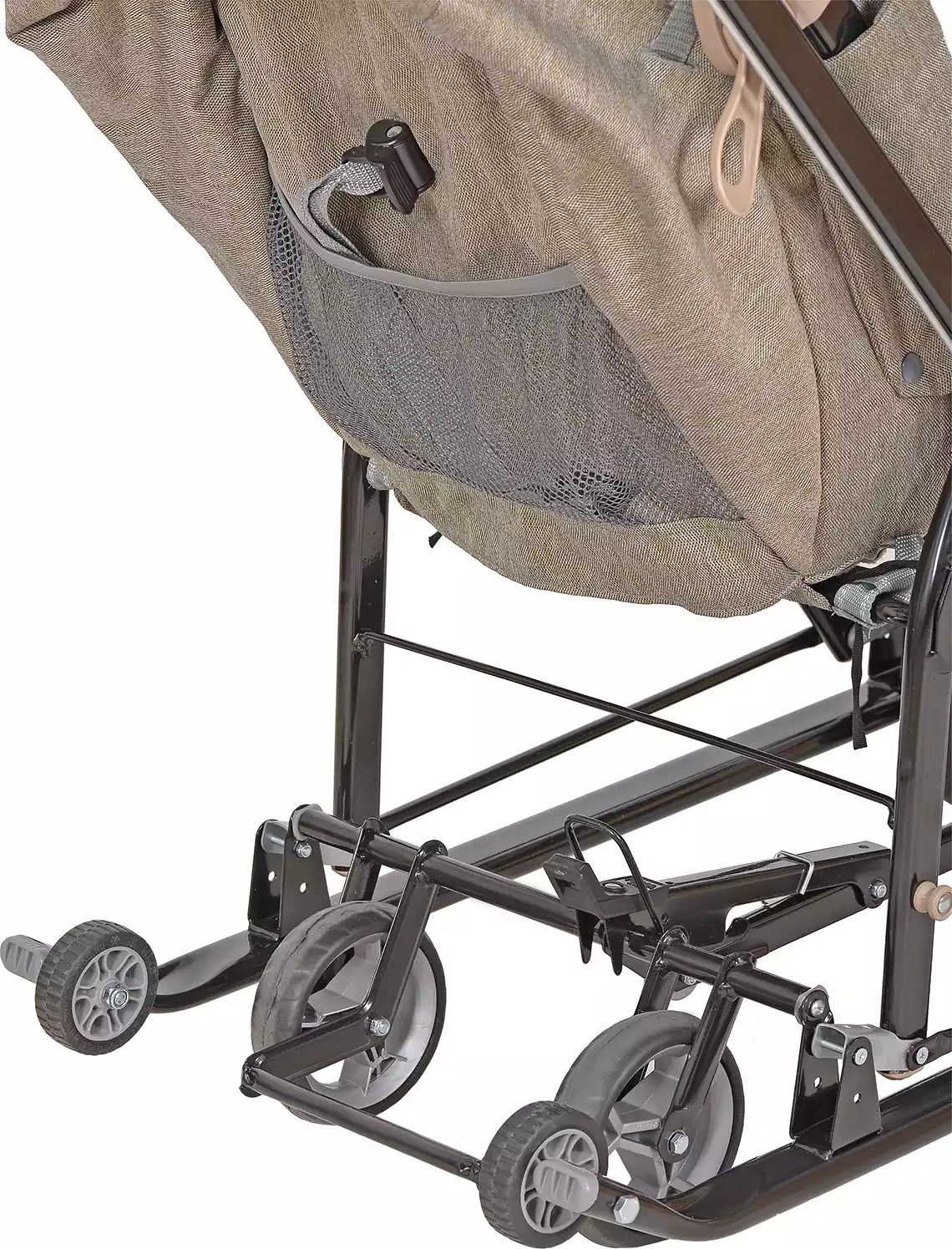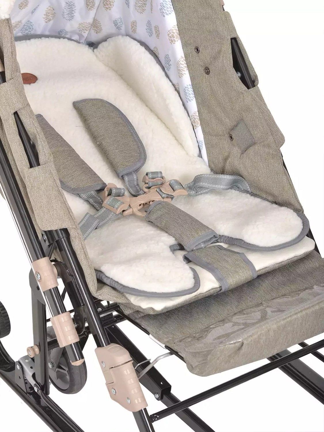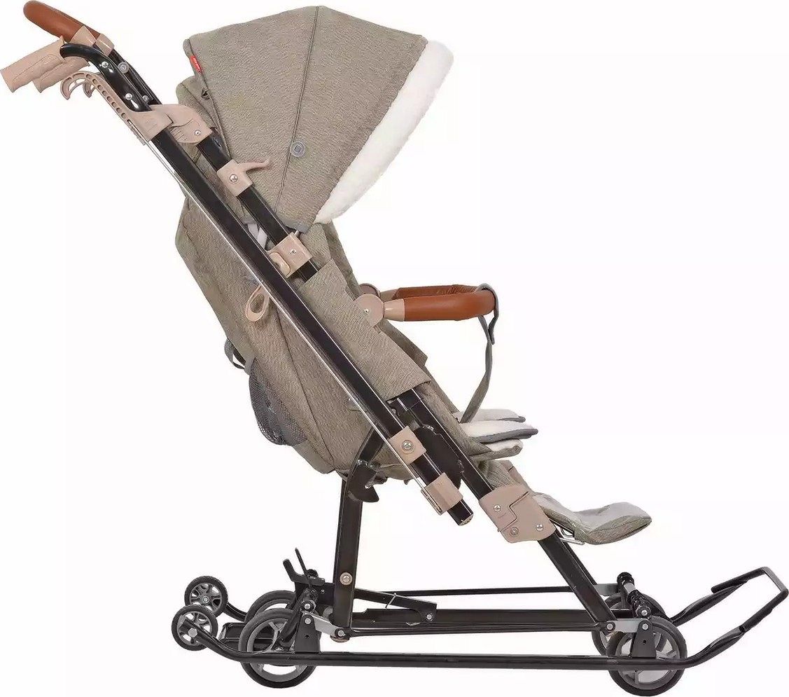 Основой конструкции служат плоские полозья шириной 40 мм и высокопрочный стальной каркас, который гарантирует долговечность и надёжность. Удобный механизм качания сглаживает движение коляски по неровностям, создавая плавный ход. При складывании коляски автоматически изменяется угол наклона спинки, что делает процесс складывания быстрым и удобным. Также предусмотрено автоматическое складывание каркаса.