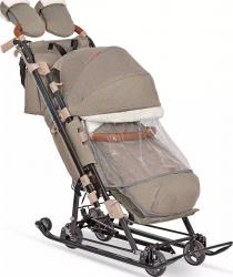 Одной из ключевых особенностей является механизм смены полозьев на колёса, который позволяет легко переключаться между режимами санок и коляски благодаря выдвижной колёсной базе. Высокий складной трёхсекционный козырёк с меховой окантовкой (шерстяной мех) защищает ребёнка от ветра и снега. Козырёк можно дискретно перемещать с помощью трещётки, а плавная регулировка спинки до положения лёжа осуществляется новым фиксатором.