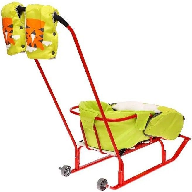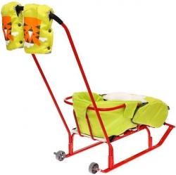Материал: каркас – металл; сидение – рейки; ремень безопасности – ременная лента; колеса – морозостойкая пластмасса