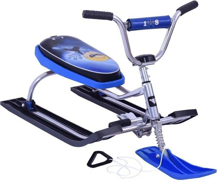 Он имеет легкую сварную раму из прочной стали. Боковые и передние лыжи устойчивы к низким температурам и хорошо скользят по льду, снегу и даже асфальту. Амортизация помогает смягчить удары и неровности на поверхности, по которой движется снегокат. Руль имеет прямоугольную форму и оснащен ограничителями, чтобы ребенок не мог вращаться вокруг оси, когда теряет контроль. Есть также цветные пластиковые детали.