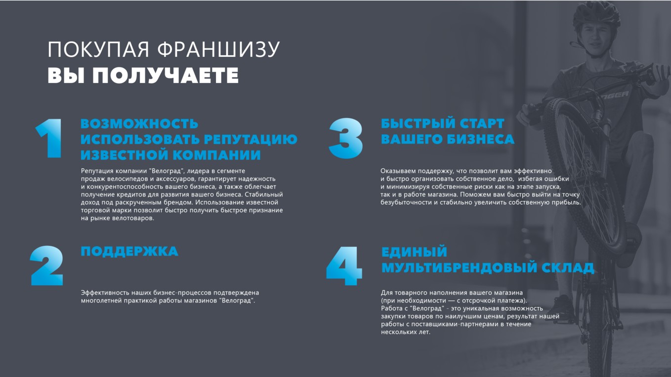 Открыв франшизу магазина велосипедов, вы получаете возможность развивать успешный бизнес в растущей индустрии спортивного оборудования.